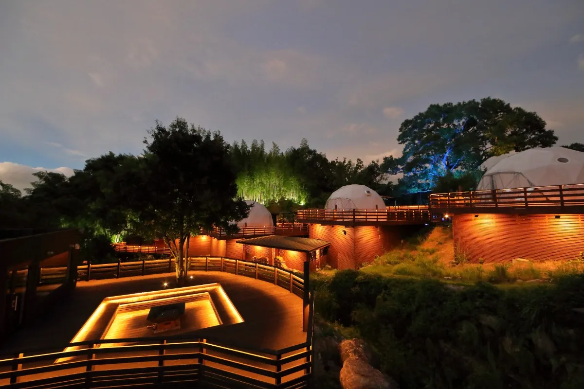 ドーム型テントと木の香りが魅力的なテラスを備えたログハウスが用意されたグランピング施設。VIPプランではドームとログハウスをセットで利用できます。